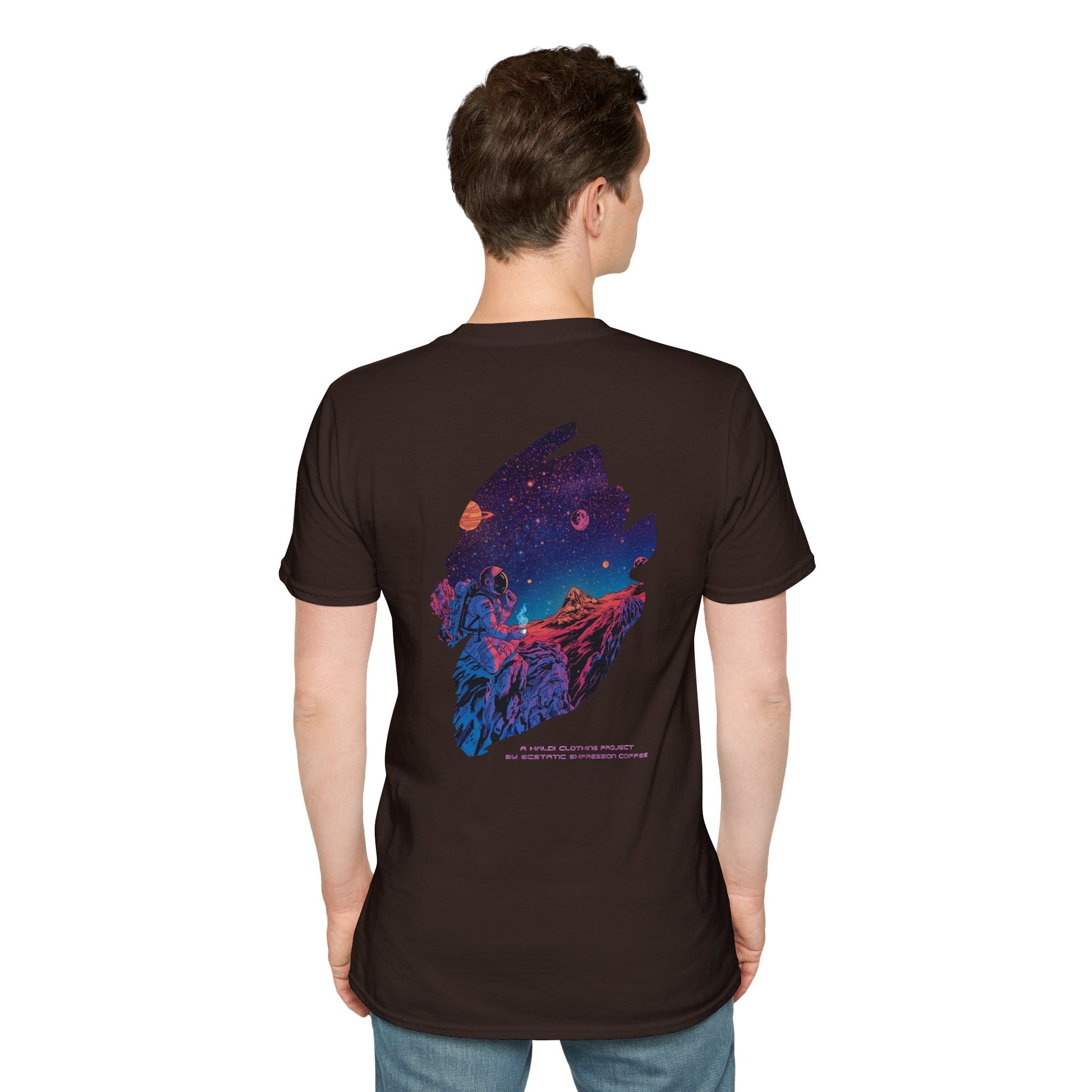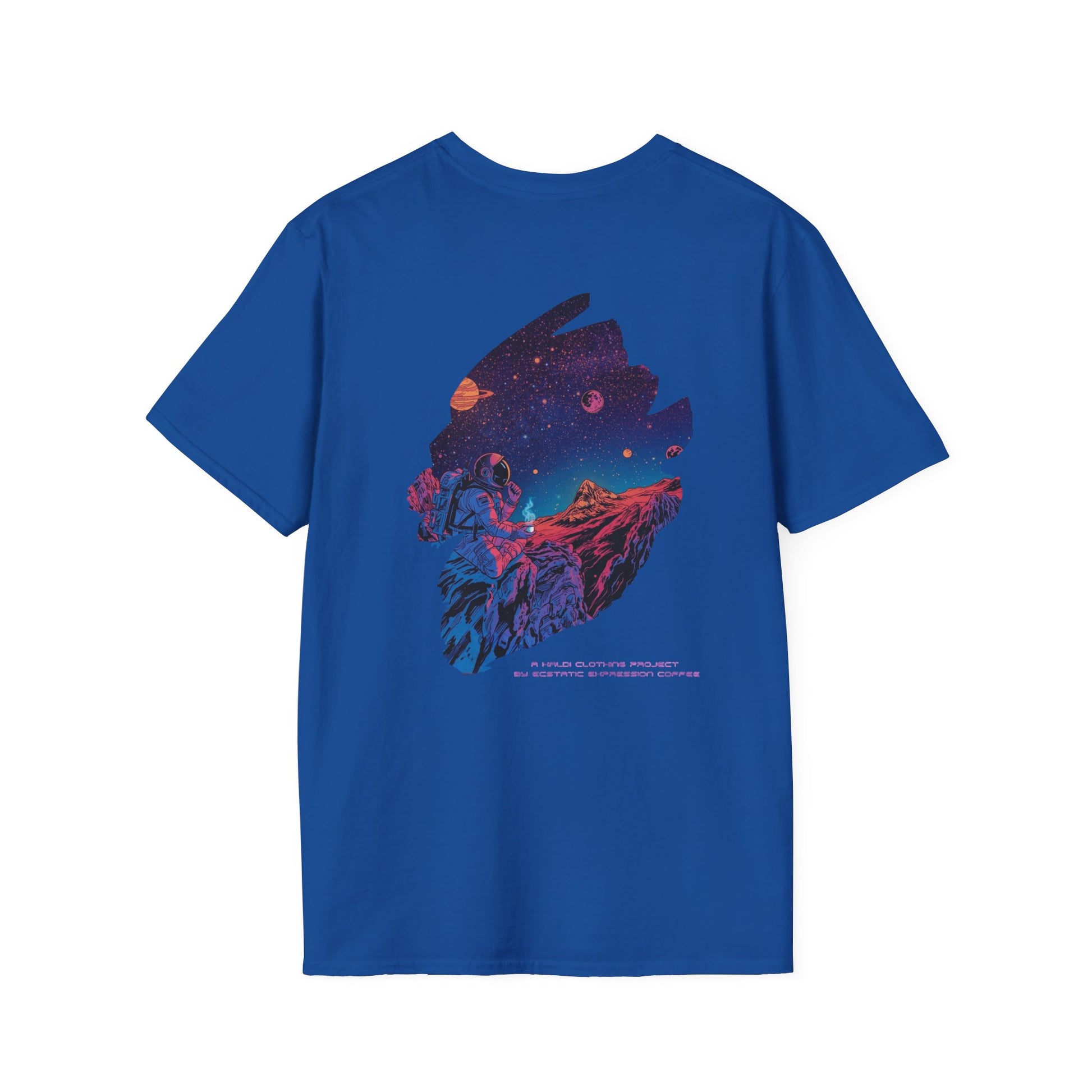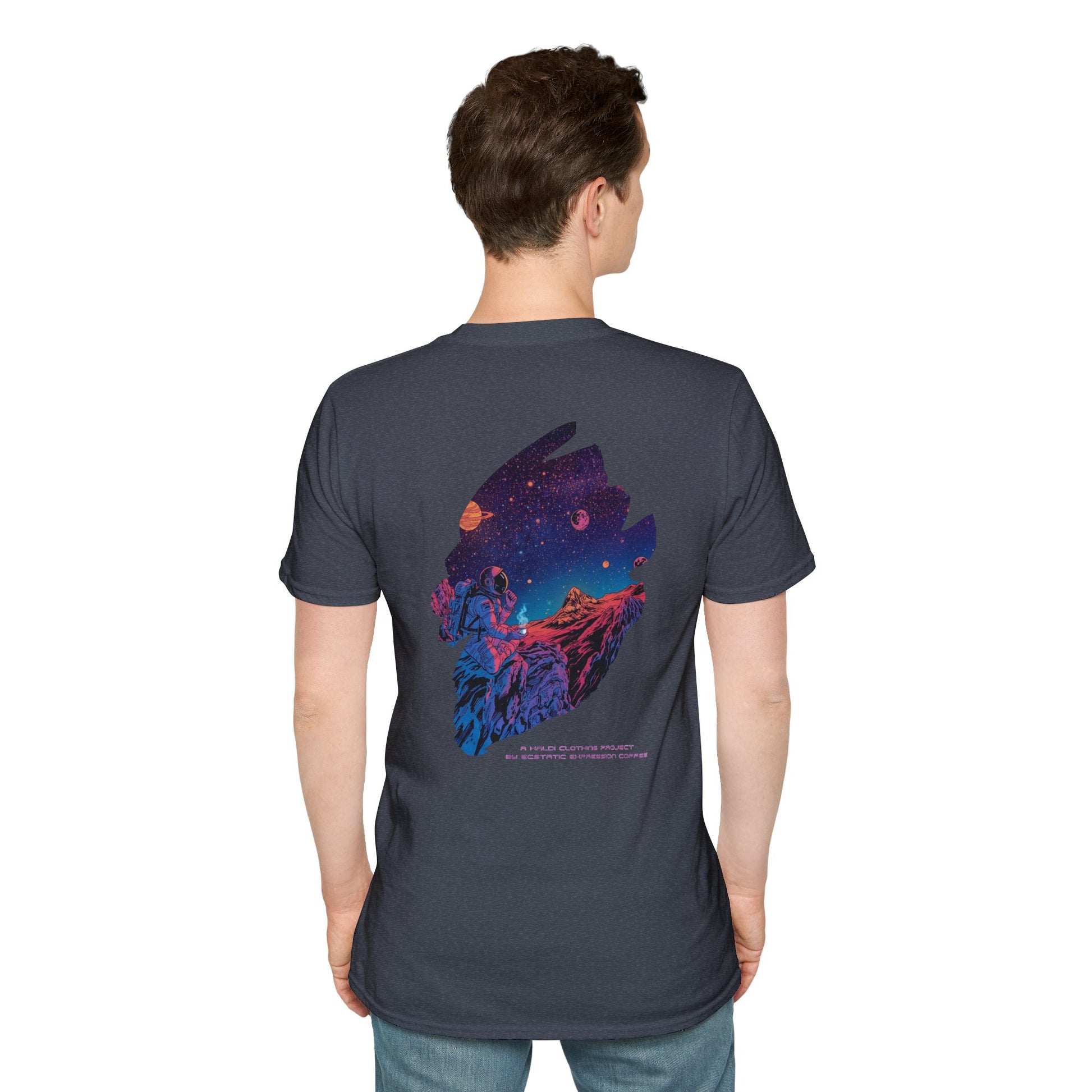 This black cotton tee carries a bold, cosmic-adventure design that feels like a midnight quest on fabric. Rich neon colors—electric purples, volcanic oranges and deep space blues—wrap an astronaut-like figure and a rugged landscape into a single sweeping scene. The imagery reads like a story: moving from a blazing, high-energy front print to a quieter starlit scene on the back. Wear it when you want your outfit to tell a scene — for late-night drives, convention floors, or sketching sessions under streetlights. The soft ring-spun cotton lay feels light and breathable, while the clean crew neckline and classic fit keep the silhouette wearable every day. It’s for people who live between playlists, science fiction panels, and campfire philosophy—this tee speaks their visual language and holds up wash after wash.